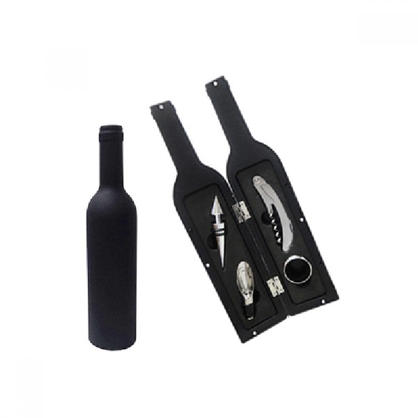Conjunto para vinho estojo emborrachado em formato de garrafa contendo 4 peças, 1 bico dosador, 1 tampa de metal para garrafas de vinho, 1 anel para gargalo, 1 saca rolhas com lâmina.