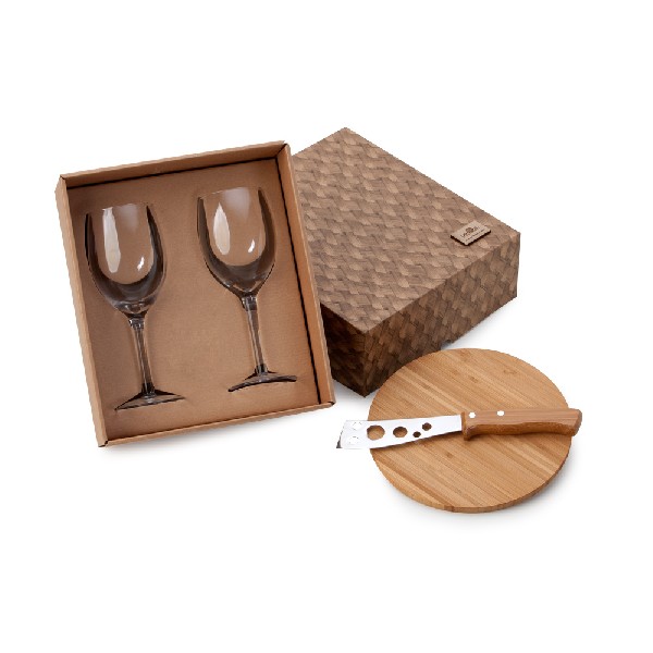 Kit com 02 taças de vidro para vinho 380ml - 01 tábua para queijo em bambu 01 faca para queijo em bambu/aço inox.