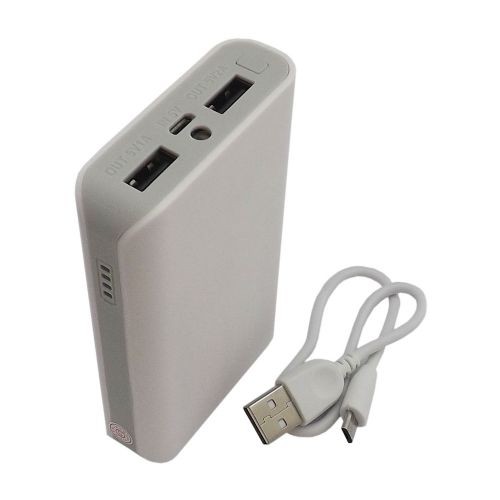 Powerbank plástico com lanterna. Possui duas saídas de 5V, sendo uma de 1A e outra de 2A. Possui luz de emergência e indicadores de carga. Acompanha 1 cabo usb/v8