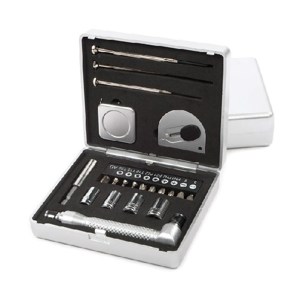 Kit ferramenta 21 peças com caixa de plástico resistente, para abrir basta pressionar botão “push” na parte central. Possui: 3 mini chaves de fenda, trena 1 metro, estilete, conjunto 10 pontas(4 chaves phillips, 2 chaves fenda, 3 chaves torx e um adaptador), 4 extensores bocais(7MM, 8MM, 9MM e 10MM), ferramenta auxiliar e chave que alonga ferramenta.
