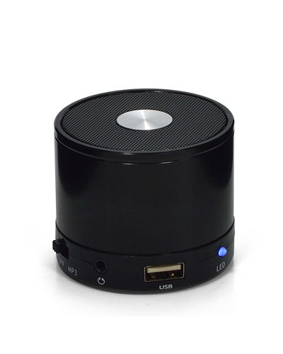 Caixa de som multimídia com Bluetooth e rádio FM. Material plástico resistente, possui a parte inferior com detalhes em relevo de algumas funções: botão Off/On; entrada para cartão MicroSD; microfone. O botão de rotação tem algumas funções: >|| M ao ser pressionado serve como Play/Pause, quando segurado ele alterna entre os modos de reprodução; ao rotacionar para esquerda <<- retrocede a faixa e quando segurado diminui o volume; ao rotacionar para direita +>> avança a faixa e quando segurado aumenta o volume. Possui led indicando o funcionamento do item, entrada DC5V/AUX além de utilizada para conectar o cabo para carregamento, necessário plugar o cabo nesta entrada para conseguir a sintonização no modo rádio(quando estiver neste modo, aperta o botão >|| M – Mode/Play para o início da sintonização) e entrada USB. Parte inferior com detalhe emborrachado anti-deslizante, acompanha cabo USB/Aux para recarregar.