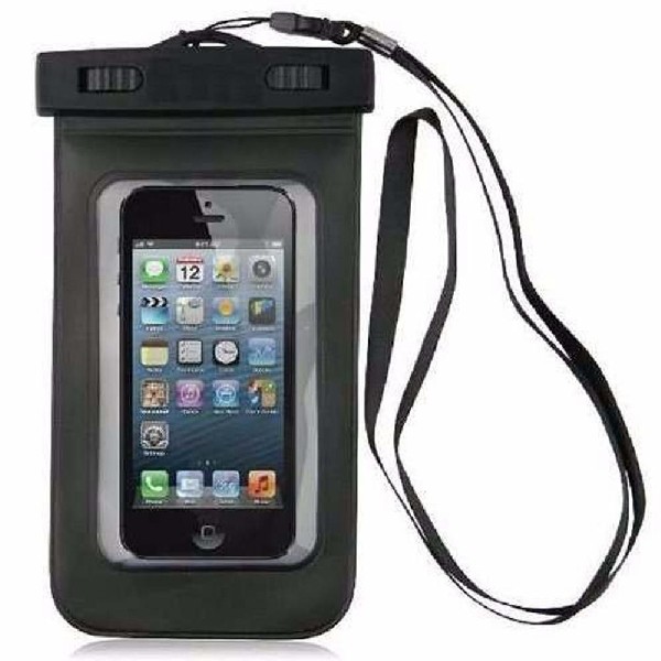 Case impermeável universal para smartphones com cordão de nylon de tamanho regulável, fabricado em PVC.