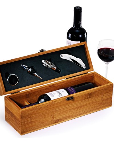 Kit para Vinho com 04 perças em Caixa de Bambu com Espaço para Garrafa de 750ml Contendo: 01 Tampão, 01 Direcionador, 01 Corta Gotas, 01 Abridor Saca-Rolhas e 01 Termômetro (Med.:365x110x120).
