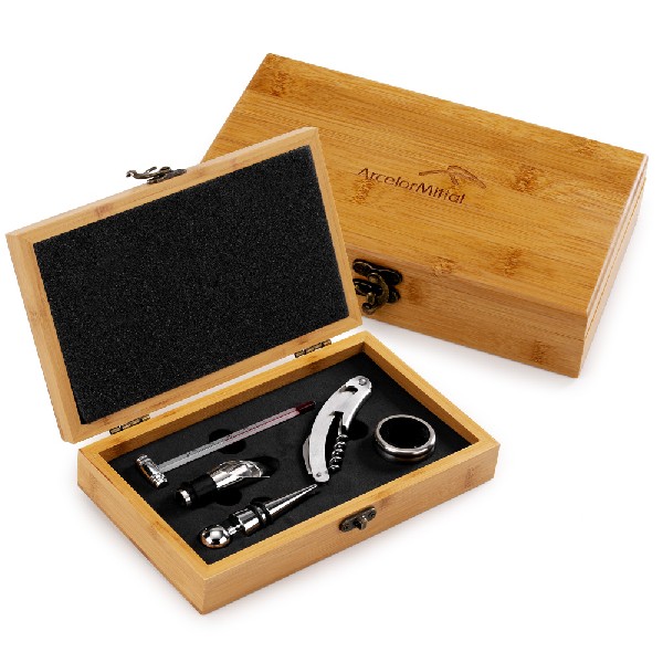Kit para vinho em caixa de bambu contendo: 01 tampão, 01 direcionador, 01 corta gotas, 01 abridor saca-rolhas e 01 termômetro.