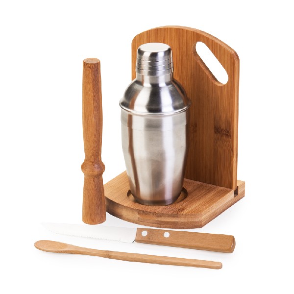 Brinde: Kit caipirinha 6 peças com tábua, base, amassador, colher e faca de mesa 4" em bambu/aço inox e coqueteleira em aço inox 350ml.