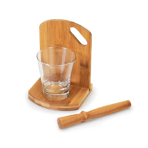 Kit caipirinha 4 peças com tábua, base, amassador em bambu e copo de vidro para caipirinha 350ml.