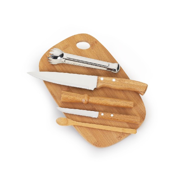 Kit para bar em caixa kraft com tábua oval, acompanha amassador, colher, faca 7" e faca de mesa 4" em bambu/aço inox e pegador de gelo em aço inox.