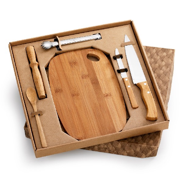 Kit bar em caixa para presente com tábua oval de bambu, amassador, colher, faca 7" e faca de mesa 4" em bambu/aço inox e pegador de gelo em aço inox.