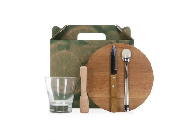Colher 18 cm x 2,7 cm – Copo 10,7 cm x 9 cm – Faca 19,5 cm x 1,9 cm x Socador 12,9 cm x 2,6 cm – Tábua 20 cm x 20 cm x 1,2 cm - Embalagem 26,7 cm x 25,4 cm x 13,3 cm