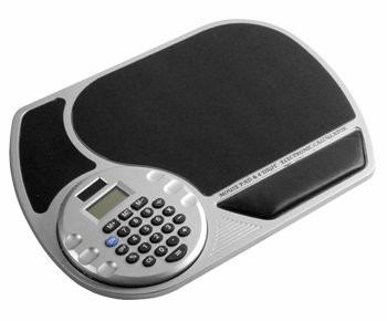 Mouse pad com calculadora plástica. Material plástico prata, mouse pad preto emborrachado com apoio para mão revestido com espuma, calculadora solar de 8 dígitos circular com detalhes em relevo na lateral(acompanha uma bateria L1131) e área plástica em preto para personalização.