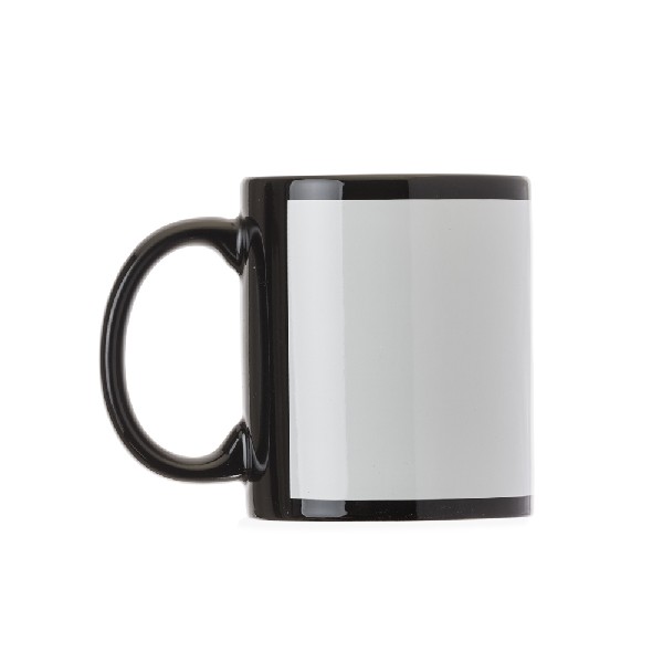 Caneca de cerâmica 350ml preta interna e externa com tarja branca, ideal para personalização.