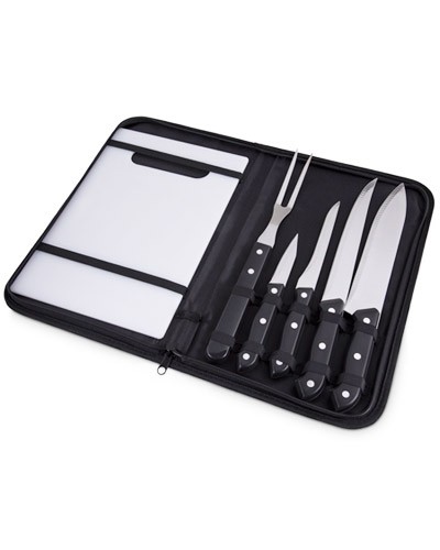 Kit para churrasqueiro personalizado com a logomarca em ótimo espaço. Resistente e elegante esse conjunto é composto por 1 lindo estojo em Nylon, 1 tábua de plástico, 1 garfo e 4 facas.