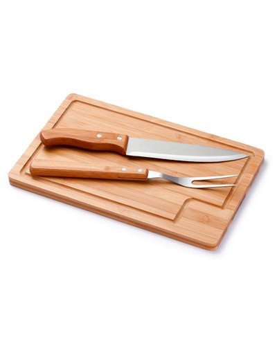 Kit churrasco para brindes. Composto de 1 tabua de bambu, 1 faca e 1 garfo