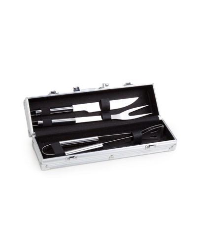 Kit para churrasco personalizado com 3 peças em aço Inox. Conjunto é composto por maleta, 1 faca, 1 garfo, 1 pegador. É o brinde personalizado ideal para seu evento.