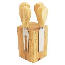 Kit queijo 4 peças com base de madeira com imãs. Possui: faca reta, faca com ponta, espátula e garfo inox com formato do polegador no cabo de madeira. Base retangular com quatro imãs superiores.