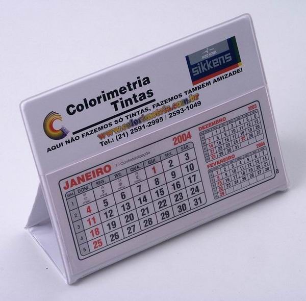Caleledario de mesa em PS bolso em PVC cristal com 12 laminas jan.a dez.em papel offset 75grs.persolanalização em silk no PS