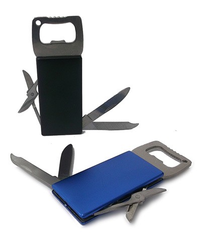 Abridor de metal personalizado para brindes com 4 funções. Elegante e resistente esse abridor de garrafa personalizado possui uma lixa, um abridor, uma lâmina tipo faca e uma tesoura. Nas cores preta e azul.