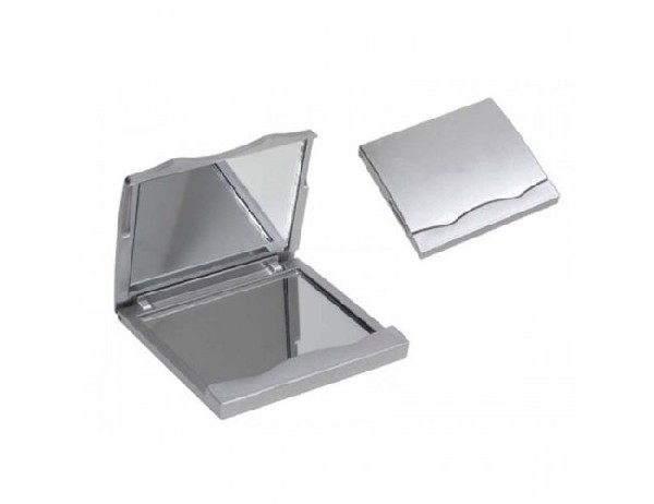 Espelho plástico duplo com aumento. Frente e verso liso porém a parte superior não é plana, possui um detalhe de ondulação.