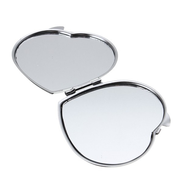 Espelho de metal duplo em formato coração com aumento. Frente lisa espelhada e verso texturizado.
