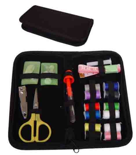Kit costura com estojo de nylon revestido internamente com veludo. Possui saquinho plástico com dois alfinetes e ganchinho, saquinho plástico com seis botões, cortador de unha, tesoura, dedal, passador de linha, porta agulhas com quatrounidades, fita métrica 1,50m e doze rolinhos de linha.