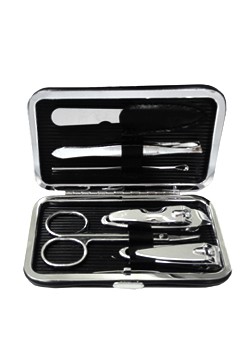 Kit manicure 6 peças em estojo de couro sintético. Possui: lixa, pinça, empurrador de cutícula, cortador de cutícula, tesoura e cortador de unha. Parte interna de plástico com suporte de couro para fixar as peças. Para abrir o estojo basta apertar o botão central.