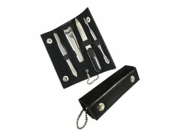 Kit Manicure 4 peças em estojo de couro sintético revestido com veludo interno. Possui dois botões para lacrar o estojo, acompanha corrente e parte interna com alça em couro sintético. Contém: limpador de unha, lixa, cortador de unha e pinça.