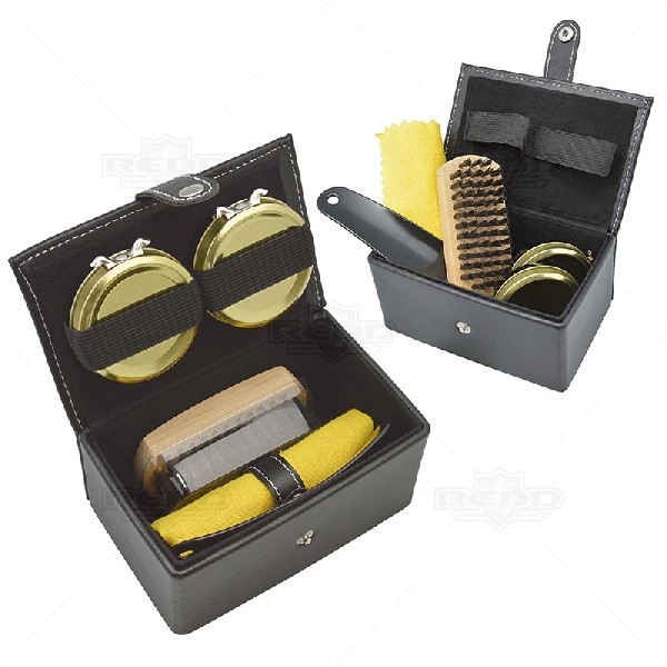 Kit engraxate estojo em couro sintético com 5 peças, costura branca e botão para abrir/fechar. Possui cera preta, cera incolor(suporte da cera em metal, para abrir basta girar a trava), calçadeira, flanela amarela e uma escova(acompanha proteção plástica). Parte interna com dois elástico para encaixar as ceras e suporte com botão para prender a escova.