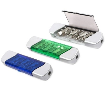 Kit Ferramenta plástico com 6 peças. Estojo prata com tampa acrílica colorida, possui dois suportes(inferior e superior) para encaixar as ferramentas. Possui: 3 chaves Philips e 3 chaves de fenda.