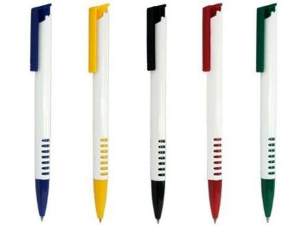 Caneta plástica corpo branco, ponteira e acionador em diversas cores.