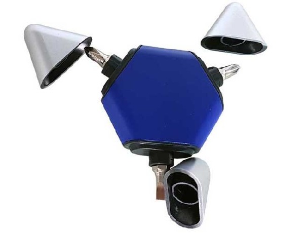Kit ferramenta triangular plástico com 3 peças. Material plástico colorido com três tampas prata, ao puxá-las contém: duas chaves philips de tamanhos diferentes e uma chave de fenda.