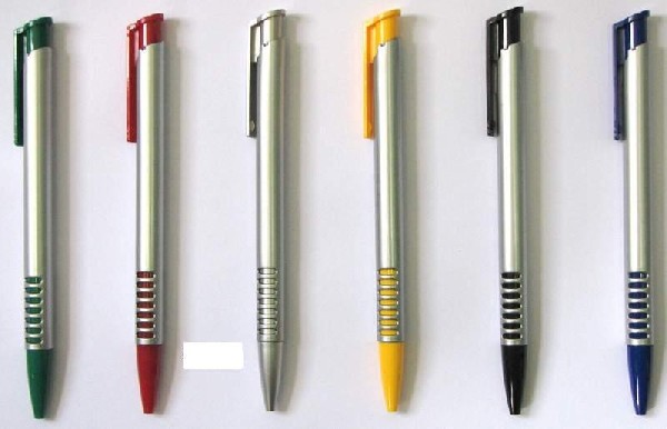 Caneta plástica corpo prata ponteira e acionador em diversas cores.