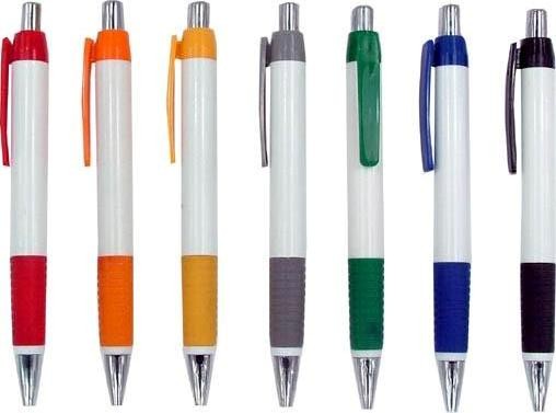 Caneta plástica corpo branco acionador e ponteira cromado, grip emborrachada diversas cores.