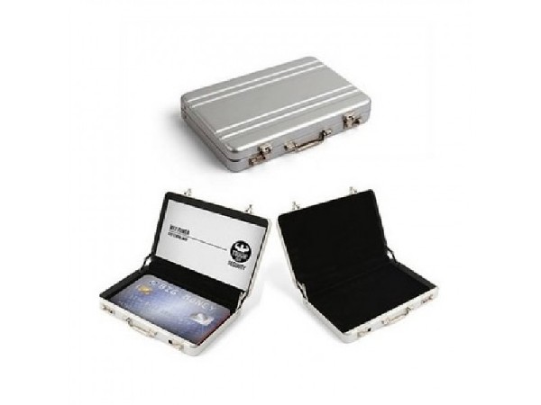 Porta cartão de alumínio formato mini maleta executiva. Possui dobradiças inferiores, alça e duas travas superiores, para abrir basta puxar os botões para as laterais sentido lado de fora. Possui quatro linhas em relevo frente e verso. Parte interna revestida de veludo com suporte plástico para cartão.