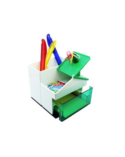 Porta Clips Personalizado multifuncional em formato de casa, com bloquinho post-it, 10 clips coloridos e porta caneta.