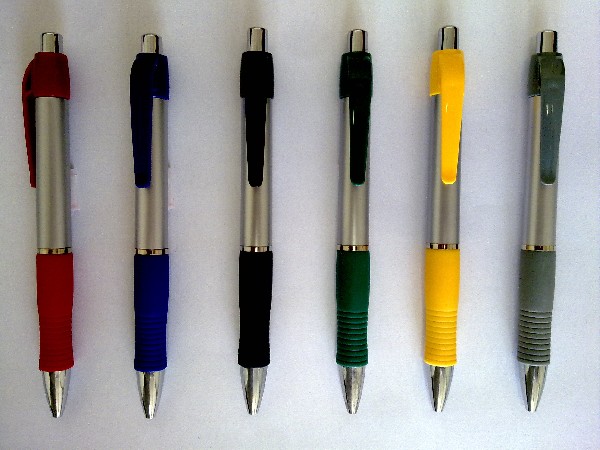 Caneta plastica corpo prata ponteira acionador e anel cromado grip emborrachado diversas cores