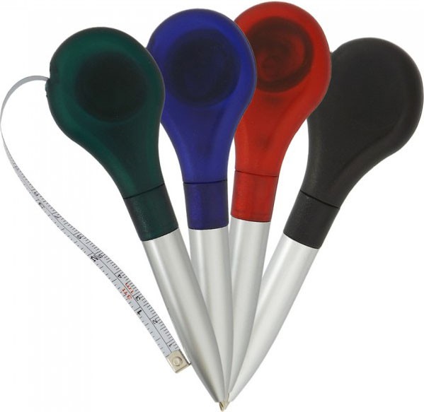 Descrição:Caneta plástica prata com detalhes coloridos, possui clip de metal e trena de 1 metro(sem trava).