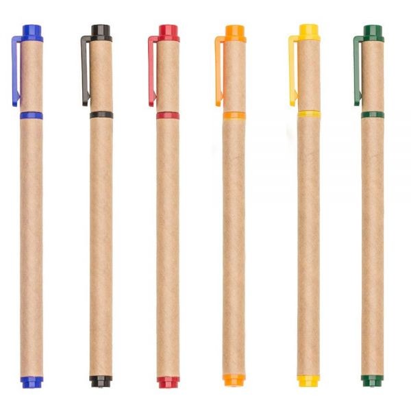 Caneta ecológica roller. Caneta de material kraft com tampa, possui clip plástico colorido, anel e parte inferior plástica colorida.