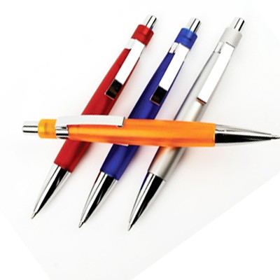 Caneta plastica diversas cores com clip metal ponteira e acionador cromado