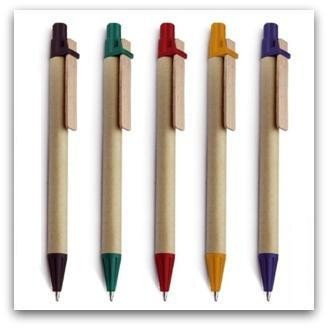 Caneta ecológica corpo em papel reciclado ponteira e acionador em plástico reciclado, clip em madeira de reflorestamento.