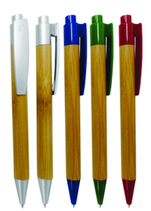 Caneta ecológica em bambu com ponteira e acionador em plástico.
