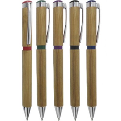 Caneta corpo em bambu clip e ponteira metal anel em plástico.