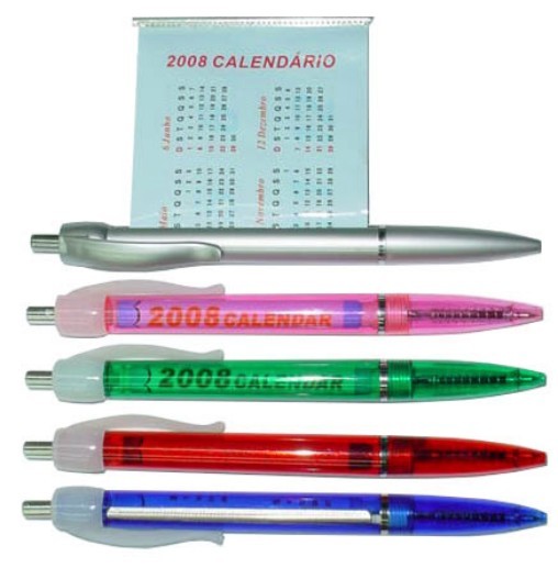 Caneta plástica com calendário.