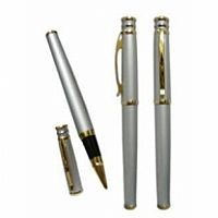 Caneta Metal escrita roller com tampa detalhe dourado.