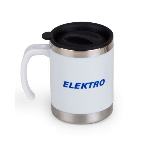 Caneca térmica 400 ml, em aço inoxidável e acabamento externo em plástico.Tampa de plástico com fecho rotacional. Personalização da logomarca em silkscreen.
