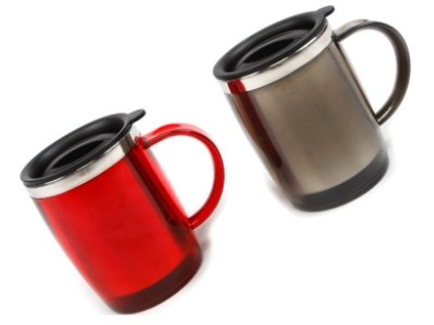 Caneca portátil com capacidade para 400 ml, material de aço inoxidável e acabamento externo de acrílico transparente.