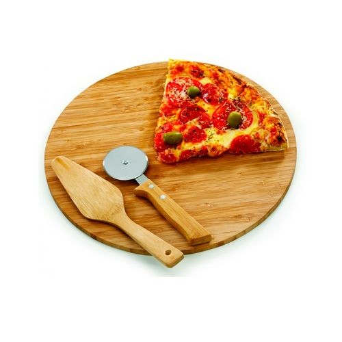 Tábua para Pizza em Bambu com Espátula e Cortador de Pizza em Bambu/Aço Inox. (Medida Tábua: 350x10mm).