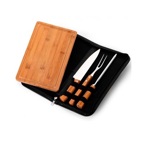 Estojo para Churrasco 4 Peças em Couro Sintético na Cor Preta com Faca 8", Afiador, em Bambu/Aço Inox e Tábua Retangular ST em Bambu (Med.:320x200x15mm).