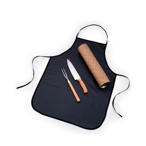 Tubo para Churrasco com Faca 8", Garfo em Bambu/Aço Inox e Avental em Couro Sintético na Cor Preta.