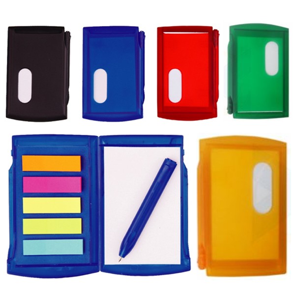 Bloco de anotações com post-it e mini caneta, material de plástico.
