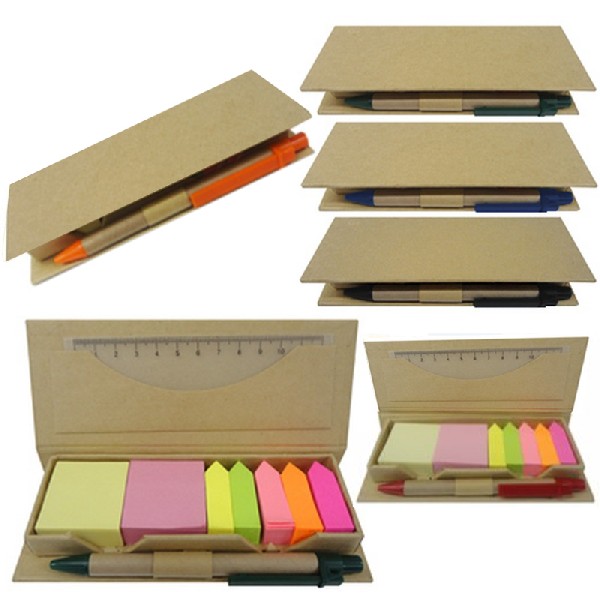 Bloquinhos de anotações ecológico com régua plástica de 12 cm, post-its coloridos e caneta reciclável.